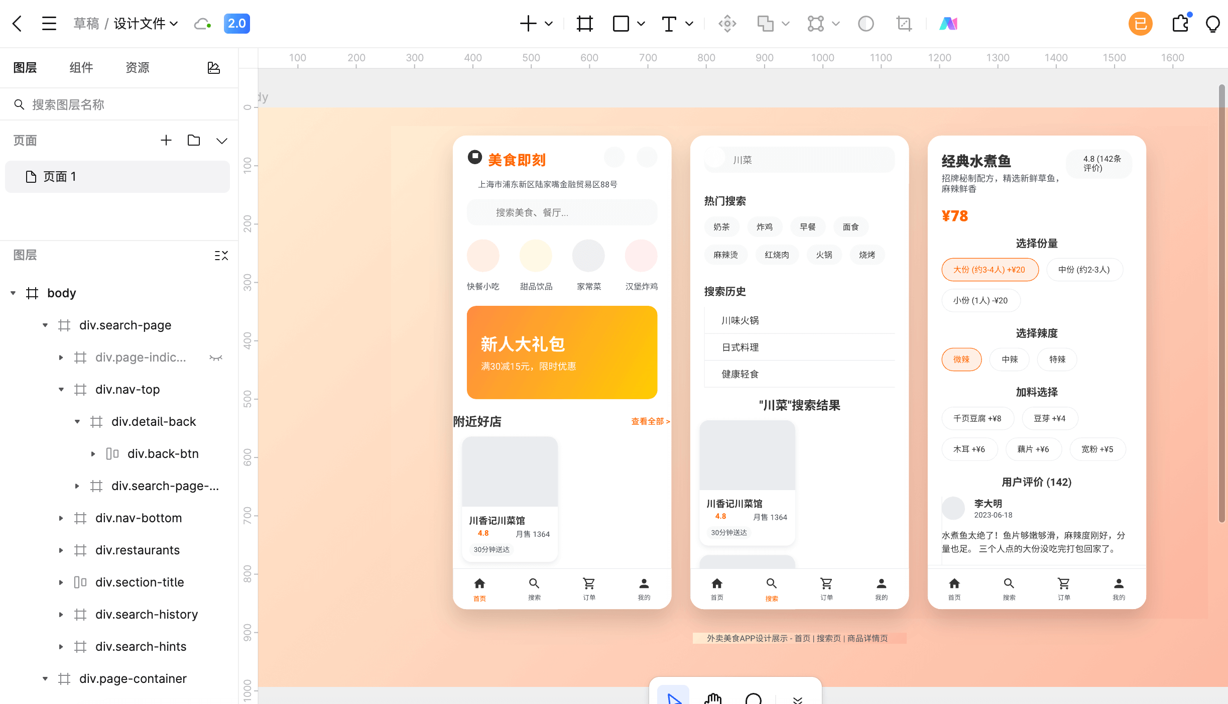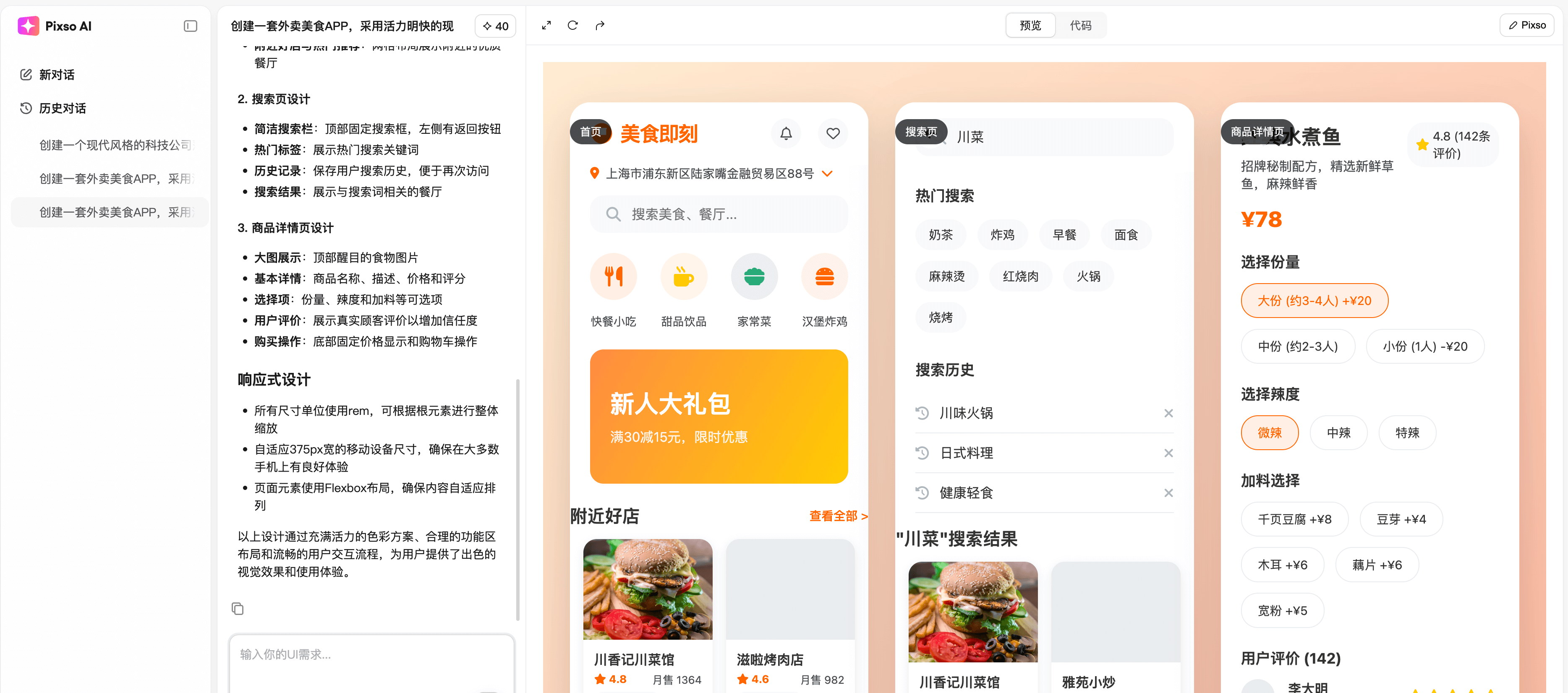 如上图所示,进入Pixso AI设计对话页面,在输入框输入你需要生成的界面提示词“创建一套外卖美食APP,采用活力明快的现代风格,以白色为底色,搭配橙色主强调色、黄色作为辅助强调色。该APP需包含3个页面:首页、搜索页、商品详情页。“Pixso AI很快就在画面的右侧创建出了对应的UI界面以及html代码,如果需要修改,可以直接再词输入指令,让Pixso AI修改。另外,也可以直接点击右上角的Pixso编辑按钮,进入Pixso工具编辑画布进行调整,Pixso AI可将生成的页面转换为可编辑的Pixso设计图。