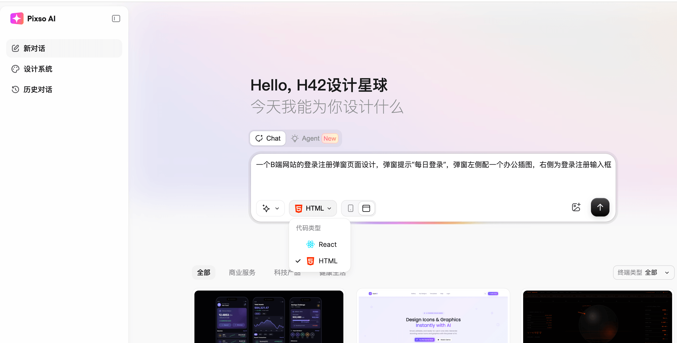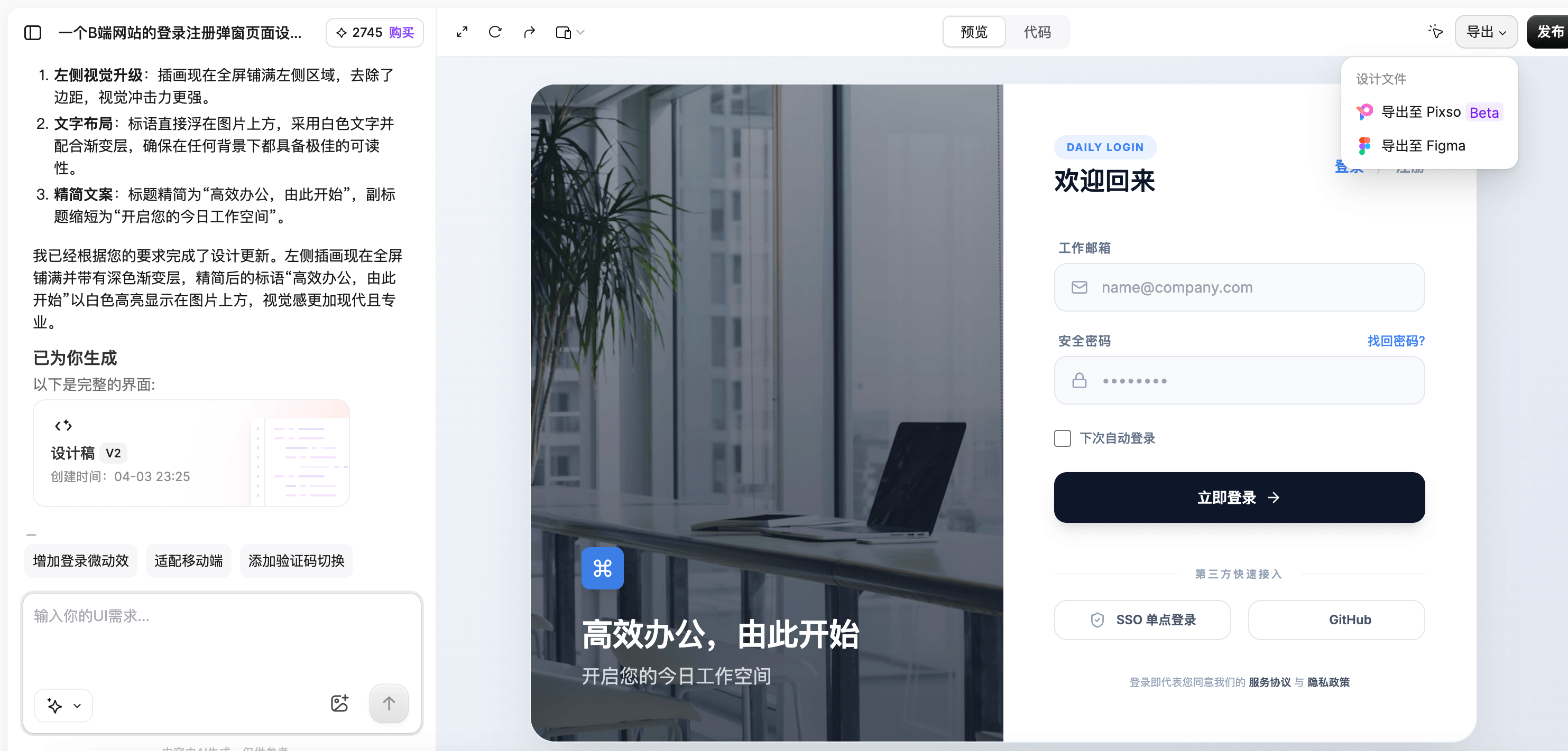 登录账号后,在Pixso AI的提示词输入框输入你的网页弹窗设计需求,如:“一个B端网站的登录注册弹窗页面设计,弹窗提示“每日登录”,弹窗左侧配一个办公插图,右侧为登录注册输入框“,然后选择生成代码为HTML与网页端,方便后续转为Pixso设计文件。