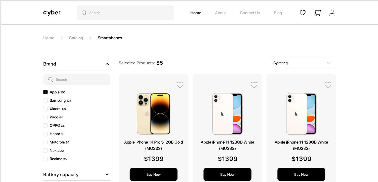 面包屑导航常见于包含多个类别的复杂电商网站,例如在上图的电商网站,使用”Home>Catalog>Smartphones“给用户提供了清晰的指导方向,从而确保用户的浏览过程更加流畅。