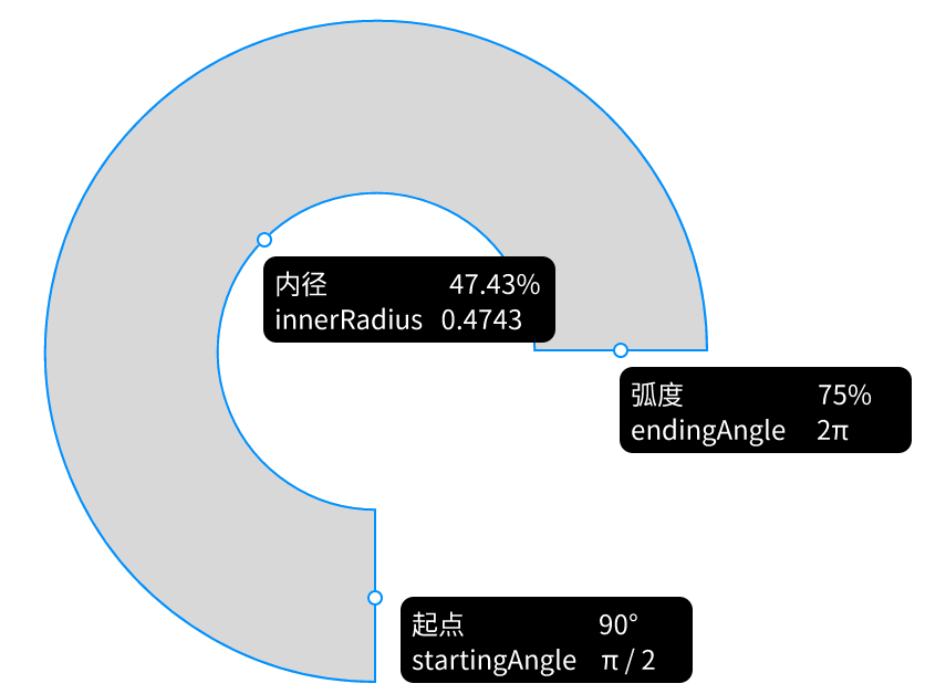 其中 innerRadius 与面板中内径相同,startingAngle 为面板起点角度对应的弧度,endingAngle 与面板弧度的转换关系为 弧度 = (endingAngle - startingAngle) / 2π * 100%。