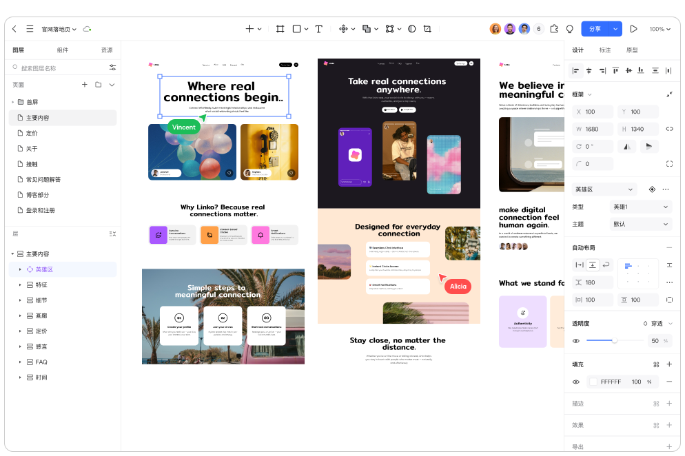 利用自动布局、组件与样式管理,快速启动大型项目并保持设计的一致性,将灵感极速转化为高品质网页。